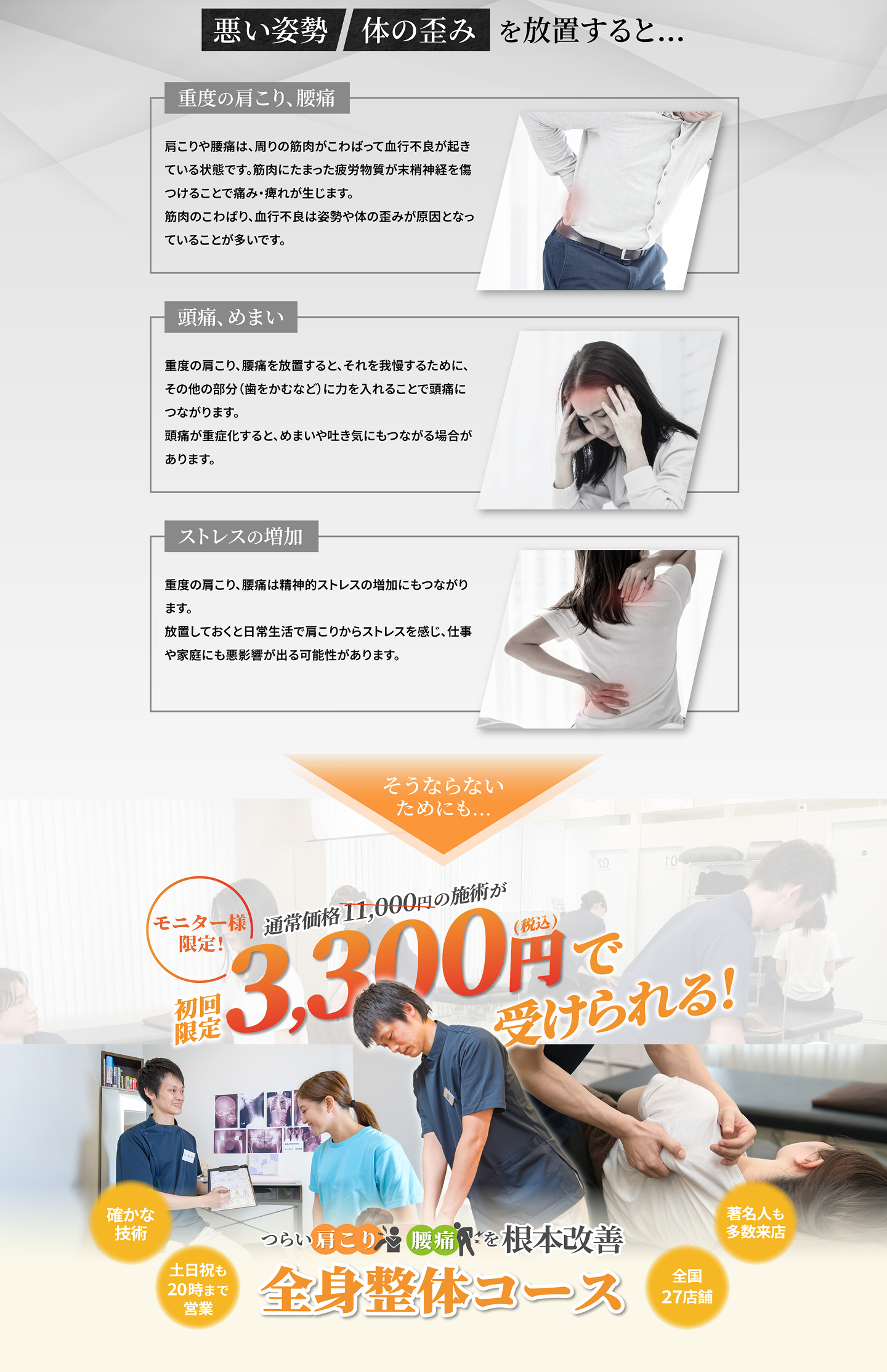 ※必須項目を入力して下さい。 各項目をご入力いただき「入力内容確認」をクリックしてください。 各項目をご入力いただき「入力内容確認」をタップしてください。 お名前必須 電話番号 必須 メールアドレス 必須 ご希望の店舗 必須 ─店舗を選択してください─ 横浜院 川崎院 町田院 藤沢院 池袋院 門前仲町院 武蔵小杉院 恵比寿・代官山院 新横浜院 人形町院 平塚院 三軒茶屋院 海老名院 新橋・虎ノ門院 新宿院 上野院 赤坂院 川口院 下北沢院 渋谷院 中野院 難波院 栄院 五反田院 北千住院 神田院 札幌院 MEDICAL BODY By dazzy 渋谷店 ボディマネジメント整体院 蒲田店 ボディマネジメント整体院 吉祥寺店 ボディマネジメント整体院 錦糸町店 中野プロポーション整体院 大船院 中野プロポーション整体院 代々木上原院 中野プロポーション整体院 大井町院 お身体の悩み 必須 ※来店可能日時は、ご予約フォームをご回答いただき次第、当院よりご連絡させていただきます。 入力内容確認